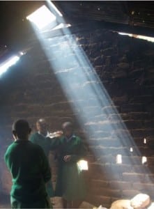 The conditions in the kitchen were deplorable and dangerous. Every day, when the cook, Matua Nzoka and three student volunteers made lunch for the school’s 350 students, the kitchen became a literal smoke box. The only ventilation was through a pulled-back roof panel, leaving the walls black with soot. This cave-like box contained several three-stone cooking fires, and nothing much else. There was no interior floor slab, so Matua and the students had to cut vegetables on the ground before putting them on the fire.