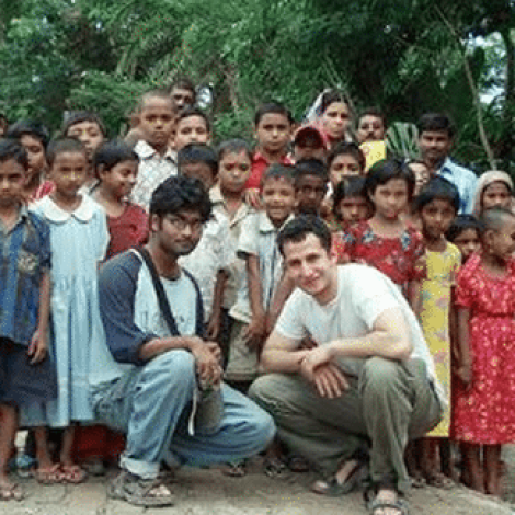 Josh Sperling (front-right) poses with Imrul Kayes, co-founder of Architecture for Humanity-Dhaka (front left) and Bangladeshi school children who were affected by Cyclone Sidr, which caused heavy damage in Bangladesh on Nov. 17, 2007. Photo courtesy of Josh Sperling