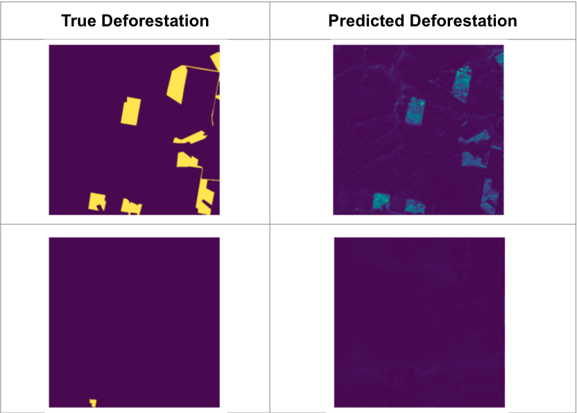 After training the model, the results are promising but further refinement is needed. When locating large areas of deforestation, the model can perform accurately. However, when only a small amount of deforestation is present, it overgeneralizes and predicts no deforestation at all. Further development could include using a “course to fine” approach – first ruling out areas that are true negatives, then zeroing in on what remains to find the true positives.