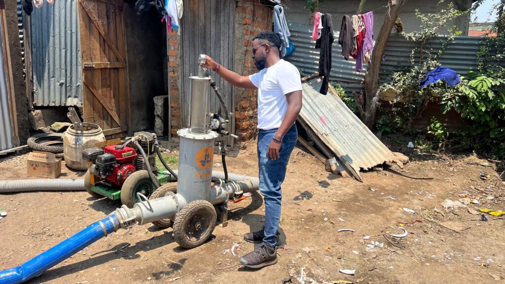 Field validation in Kisumu, Kenya – inspecting the PuPu Pump setup before a pit assessment.
