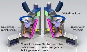 Cranfield Univeristy’s Nano Membrane Toilet treats waste without water or electricity, producing recycled water for household use along with energy and ash. The system uses the membrane to separate water from the waste and gasifies solids. The energy produced can be used to sustain the membrane process and any extra energy could be used to charge electronic devices.