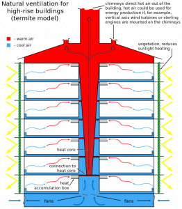 The Eastgate Centre is a 9-storey mixed-use building (shopping centre, parking, and office space) located in Harare, Zimbabwe that does not utilize an active heating and cooling system to regulate the building’s temperature. Inspired by termite mounds, the designer incorporated a ventilation system that draws and redirects hot air through the chimneys at the top of the structure.