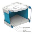 The design includes a collapsible structure with dimensions of 57 x 45 x 39.5 cm when expanded and 57 x 45 x 11.6 cm when collapsed. The empty unit weighs 2 kg and can hold 60 liters of food and 3.8 liters of water. Made from food-safe plastic, the EV-8 features an internal chamber for storing food and a water reservoir positioned between the chamber and the outer wall. The cooling capacity of the EV-8 varies based on ambient air temperature and relative humidity.