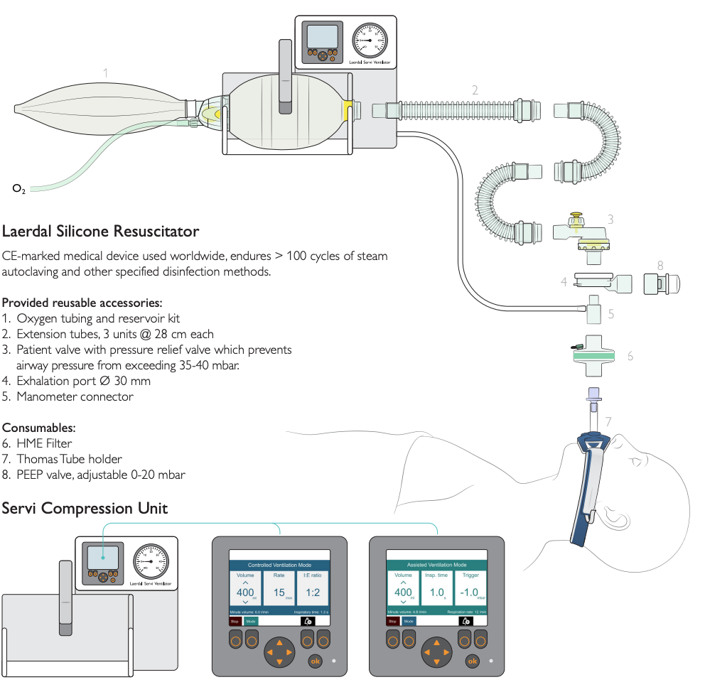 The Laerdal Servi Ventilator incorporates the following components: (1) oxygen tubing and reservoir kit, (2) three 28 cm extension tubes, (3) patient valve with pressure relief valve, (4) exhalation port with a diameter of 30 mm, and (5) manometer connector. There are three consumables: (6) HME filter, (7) Thomas Tube holder, and (8) adjustable PEEP valve. The control unit allows for tidal volume adjustment between 100-800 ml and ventilation rates between 5-30 per min.
