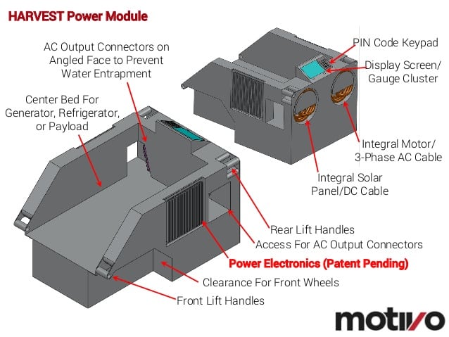 Motivo Hybrid Agriculture/Road Vehicles with Electricity Storage and Transformation (HARVEST) Electric Tractor – is an all-electric tractor that can store energy generated from a different source and deliver it on-demand. The tractor can plow a field, power a home, take goods to market, and perform many other functions transporting energy.
