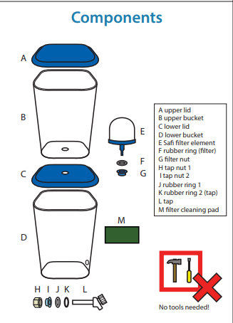 The product is locally manufactured in bulk in Malawi by Safi Water Treatment Solutions. The water filter consists of an imported ceramic element and tap, installation hardware, two locally produced plastic containers and a locally produced filter cleaning brush.