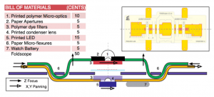 FoldscopeĀ is an ultra-low cost microscope made from common materials such as paper. It is designed to be produced affordably, to be durable, and to give optical quality similar to conventional research brightfield microscopes and in the future darkfield, fluorescence, polarization and projection microscopes. Foldscope’s functions are currently being optimized for disease-specific diagnostics. Other benefits include usage in medical education and general education on the role of unseen lifeforms in infectious diseases.