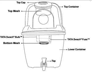 The TATA Swach filter is comprised of two parts. The upper part contains reservoir where the untreated water enters and is pre-filtered via the top mesh – TATA Swach MF membrane – which is a micro-mesh systems that remove the visible impurities. The lower middle portion has the TATA Swach Bulb to which the cartridge can be attached. The primary filtering component of the Tata Swach Smart water-purifier is the TATA Swach Bulb. The TATA Swach bulb is densely compacted with processed rice husk ash impregnated with activated silica coated with silver nanoparticles that destroys harmful bacteria and viruses from water.