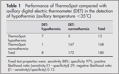 ThermoSpot performance was evaluated through a study amongst premature or low-birth-weight babies in a hospital in rural Malawi. In 100 paired measurements comparing the ThermoSpot reading with that of a low-reading glass-mercury thermometer, the device correctly identified hypothermia in every case (2 out of 100 measurements). The ThermoSpot falsely identified hypothermia on 1 occasion. (sensitivity = 100%, specificity = 95%)