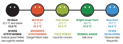 The ThermoSpot is a liquid crystal temperature indicator in the form of a flexible plastic disc (12 mm) that sticks directly onto the newborn's skin. If the infant's temperature is between 36.5ºC (97.7ºF) and 37.5ºC (99.5ºF), the black disk changes to a green smiling face to indicate that the temperature is within a normal range. If the baby's temperature drops below 36.5ºC, the smile begins to fade until the disk turns black at 35.5ºC. ThermoSpot can be used for 7-10 days consecutively and can be reused once cleaned with soap and water if it is attached to the skin with surgical tape.